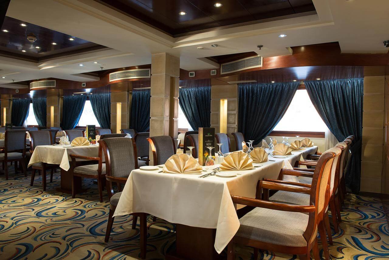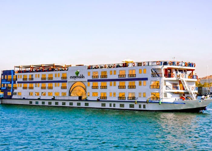 The Esmeralda Nile Cruise is a modern and luxurious 5-star cruise ship offering a premium sailing experience along the Nile River between Luxor and Aswan. Designed with contemporary elegance, this floating hotel blends comfort, style, and exceptional service to provide guests with an unforgettable journey through the heart of ancient Egypt. Each cabin and suite onboard the Esmeralda is tastefully furnished and equipped with large panoramic windows, allowing guests to enjoy the breathtaking Nile scenery in total comfort. The cruise features a spacious sun deck with a swimming pool, an upscale restaurant serving a mix of international and Egyptian cuisine, and a cozy lounge bar ideal for evening relaxation.